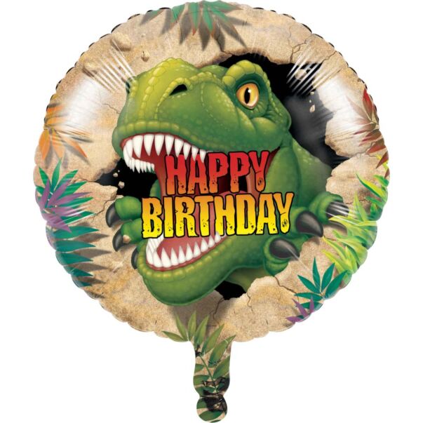 Pyöreä foliopallo Tyrannosaurus Rexin kuvalla, halkaisija 46 cm.