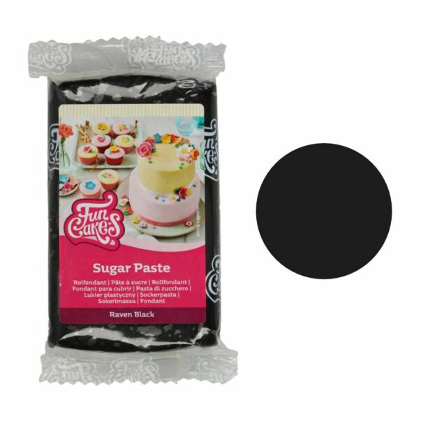 Helposti työstettävä musta sokerimassa FunCakesilta. Tämä sokerimassa on pakettia avattaessa pehmeämpi ja kovettuu hieman työstettäessä, minkä ansiosta sokerimassa on helppo muotoilla kakkukoristeiden teossa. Tämä vaniljanmakuinen ja elastinen sokerimassa on hyvä ja varma valinta kakkujen ja muffinien kuorruttamiseen.