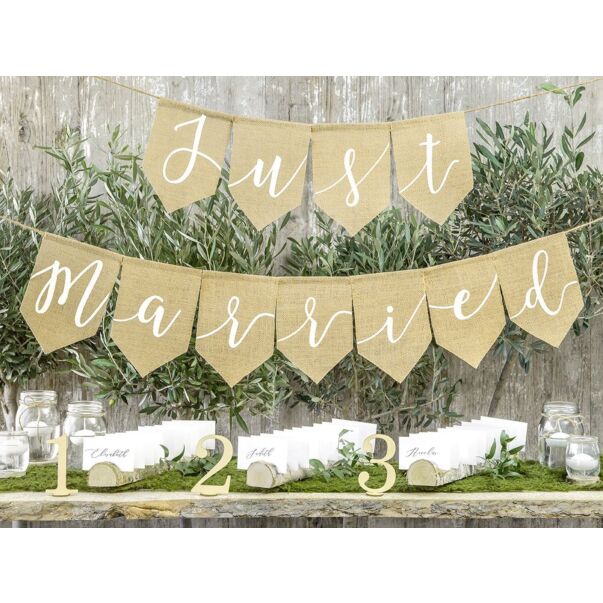 Rustiikkinen banneri häätilaisuuksiin, jossa lukee "Just married". Mainio koriste noutopöydälle, hääsalille tai muuhun paikkaan missä halutaan luoda maalaistyylinen tunne.