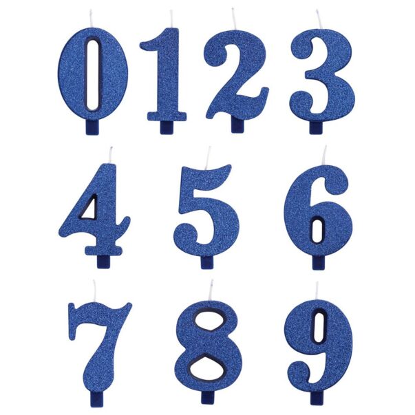 Sininen numerokakkukynttilä glitterillä, 7 cm.