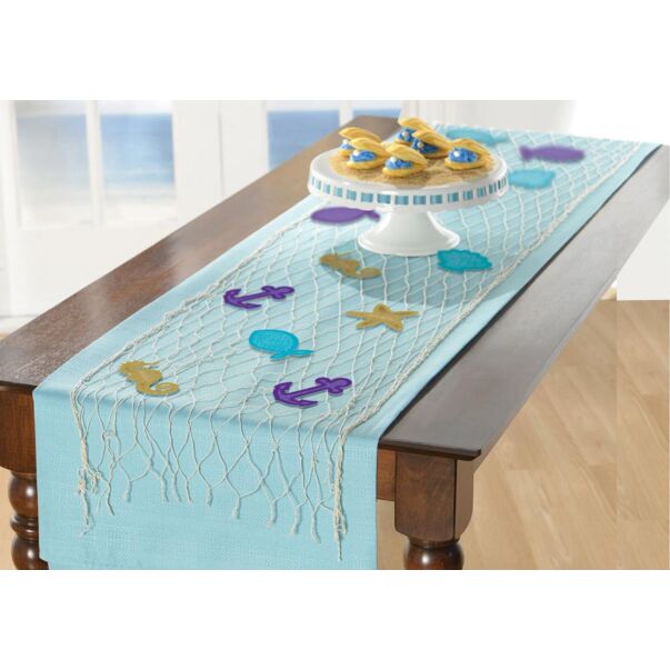 Merihenkinen kattaus-setti, kalaverkko ja pöytäkoristeet.