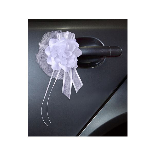 Valkoinen silkkiruusu tyllalla ja silkkinauhalla. Pohjassa tarra jolla voi kiinnittää ruusun. Erinomainen esimerkiksi auton kahvan koristeluun!